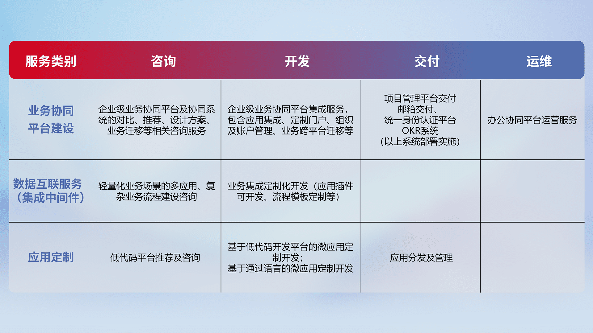 针对钉钉、、、企微、、IDaas等平台级产品提供产品的规划、、、、方案、、、交付、、定制化开发等服务,,,实现如统一协同办公、、、、智能客户服务、、、、混合会议管理、、、、智能数据查询、、、等业务场景,,实现数字化转型。。